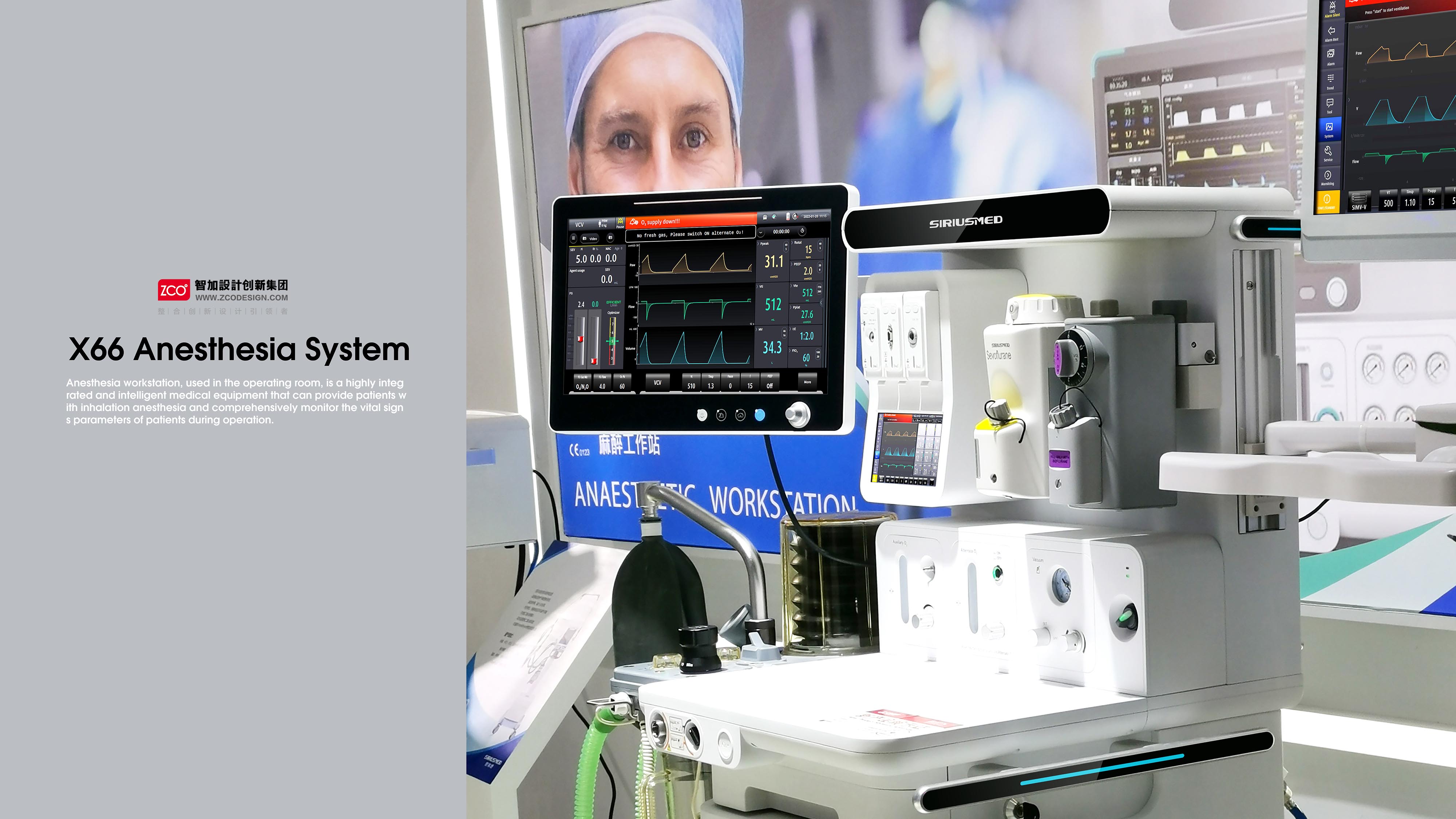 主體采取圓角和圓形的有機(jī)組合,溫潤柔和,給人以親和的人機(jī)感受。底座設(shè)計成飛碟的形式,讓麻醉機(jī)充滿了輕盈的懸浮感。麻醉機(jī)上部采取模塊化的設(shè)計思路,將回路,儀表盤,蒸發(fā)罐,顯示屏等進(jìn)行整體化設(shè)計的同時,每個部分的操作區(qū)域劃分清晰,非常有利于醫(yī)生的便捷準(zhǔn)確的操作,也有利于組裝、運(yùn)輸和維護(hù)。